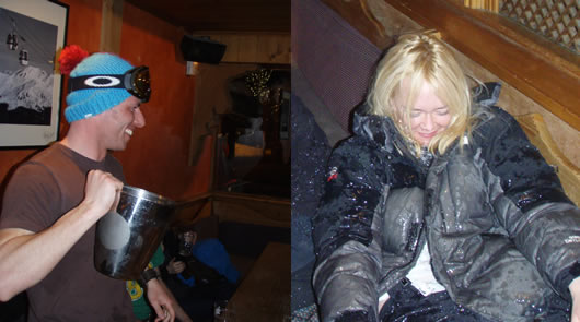 As I was listening to the recent news regarding cricket tycoon Sir Robert Stanford who had disappeared off the radar I was going reminded of a story a wrote a while back insinuating the reason the US army couldn’t find Saddam Hussein was because he was hiding in 1850 (better than a hole in the ground outside Tikrit). I made up a fake lift pass with his photo etc. Suffice to say it went down quite well. Anyway before I could do something similar the Federal government found him outside Viginnia. Damn the efficiency of the FBI. According to a Monsignor at the Vatican we’re all sinners, which if you knew what goes on between seasonnaires isn’t surprising. Apparently pride ranks only at No 5 for men, who are likely to have indulged in so much lust and gluttony that they are too slothful to feel angry, proud, envious or avaricious. Women are not averse to lust, but are primarily occupied with pride, envy and anger. Sloth does not set in until after gluttony and avarice. With the subject of sinners fresh in my mind it was mentioned to me that the enquirer should be renamed the Matt and Carolineshow due to their almost weekly anecdotes. Thursday night was the start of private chalet girl Tash’s birthday and gave ample excuse for some of the revellers to demonstrate Gluttony. Matt, exactly how much chocolate cake can I stick in your mouth in one go? After repeated warnings Pete(Jump) escalated a food fight from pieces of cake to bucket of iced water. A rather soggy and wined up Caroline then brought a little wrath to the party needing at least 3 people to initially restrain her. Pete might be a veteran of Iraq but I’m sure they don’t teach you how to handle drunken Carolines in RAF training. Alex, the editor. |